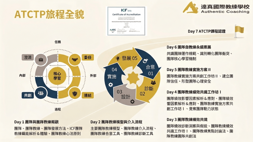 設計的團隊教練認證系列課程,目前是與達真教練國際學校合作推動,具體內容如下圖所示。