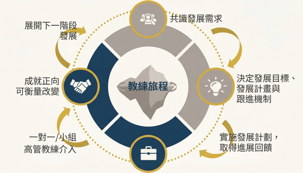 從共識發展需求展開,以同時關注任務達成與能力發展的務實取向,展開教練旅程。
